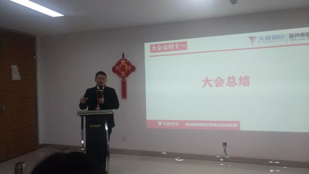 会议最后,天能股份董事长助理易炳荣先生作大会总结讲话,易总充分肯定了海外事业部在过去的一年取得的阶段性成果,也给予了大家2020年有关工作切实可行的实战建议,同时易总也代表公司,向事业部提出了更高的要求与希望,希望大家精诚团结,主动挑战,持续奋斗,创新超越,不断推动各项工作再上新台阶。2020年,要坚定不移的贯彻和执行好集团的全球化战略,以主人翁的心态,顽强拼搏的精神达成20年的目标,向着世界500强的宏伟目标不断奋斗!