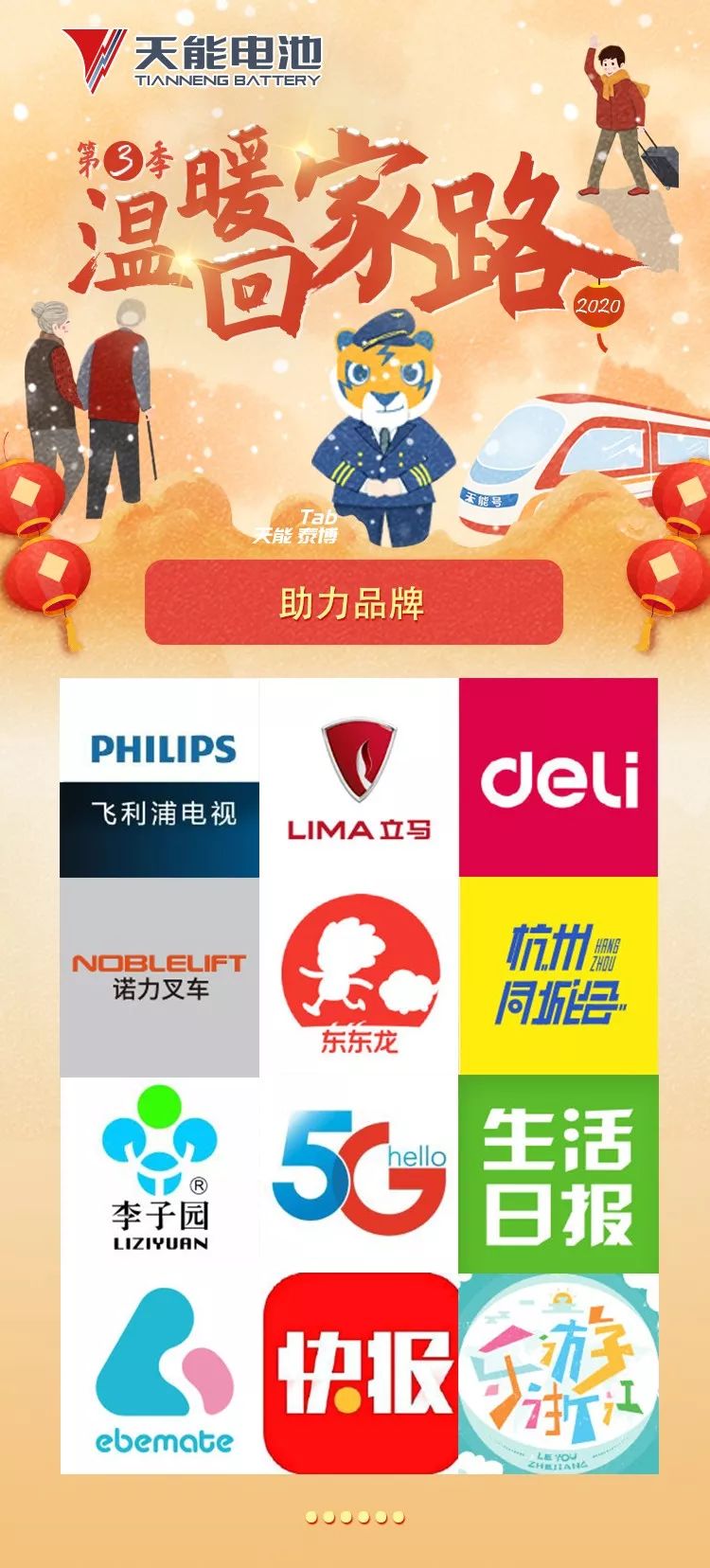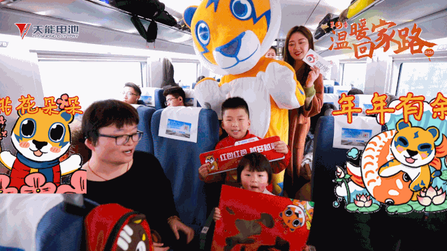 春运期间,天能在全国多条天能号高速列车、普速列车上为广大返乡的追梦人送福送温暖。天能吉祥物泰博Tab满载着福袋登上车厢,与旅客们热情互动,送上寓意平安、团圆的定制福字及充电宝、吉祥物泰博Tab靠枕等精美礼品,让每一位乘客在欢乐、感动的气氛中度过一趟特别的回家之旅。