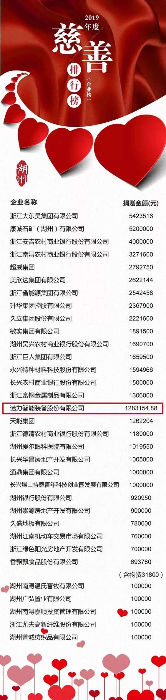 1月14日下午,由浙江省湖州市慈善总会和湖州市新闻传媒中心共同主办的湖州市第三届慈善年会在湖州市隆重举行。会上揭晓了2019年度“湖州市慈善排行榜”。董事长丁毅和公司均荣登排行榜,其中董事长丁毅位列个人慈善排行榜榜首、公司位列企业慈善排行榜第十六名。
