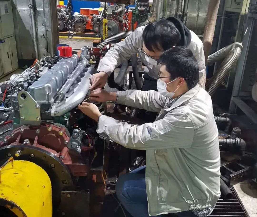 △△李金城和虞浩峰,坚守装配校车间,进行6DF3发动机现场测试