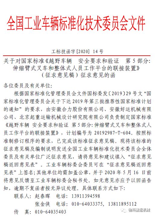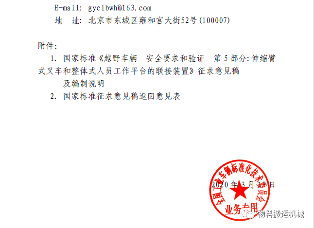 关于对国家标准《越野车辆 安全要求和验证 第5部分:伸缩臂式叉车和整体式人员工作平台的联接装置》(征求意见稿)征求意见的函