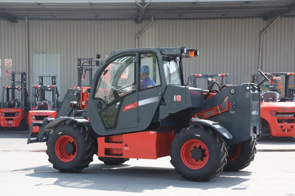 合力伸缩臂越野叉车的主要特点体现在高效与安全两个方面。在高效率方面,整机配备了静压传动系统和四轮驱动功能,三种转向模式(前轮转向、四轮转向和蟹行模式)以及流量共享工作系统和全电比例控制,提供了优越的操作灵活性和工作效率。同时,其多功能智能控制手柄进一步增强了操作的便捷性。