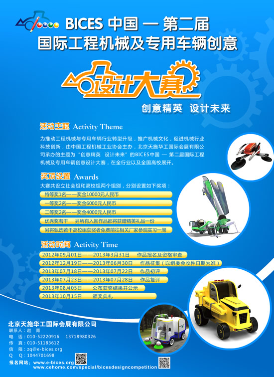 此次大赛分设高校组和社会组,参赛的作品范围覆盖了1、土方机械:挖掘机、装载机、平地机、推土机、挖掘装载机、滑移装载机、铲运机等; 2、道路机械:压路机、摊铺机、铣刨机、养护设备等;3、混凝土机械:混凝土搅拌运输车、混凝土泵车、混凝土搅拌站等;4、起重机械:汽车起重机、履带起重机、塔式起重机、随车吊等;5、桩工机械:旋挖钻机、连续墙抓斗、打桩机等;6、专用车辆:矿用自卸车、消防车、叉车及其它工业车辆等。同时,根据高校及社会组分别设置了奖项,获奖选手均获得《BICES中国-第二届国际工程机械及专用车辆创意设计大赛创意精英》荣誉证书 ;同时特等奖各1名,奖金1万元人民币;一等奖各2名,奖金6000元人民币;二等奖各2名,奖金4000元人民币;优秀奖若干。另所有入围作品都将获赠精美礼品一份。所有获奖作品及作者将在相关新闻媒体上集中展示介绍;组委会另将承担来京领取奖项的获奖者一晚食宿及往返火车硬卧或动车二等座车票及甄选若干高校组获奖者免费前往相关厂家参观实习一周。