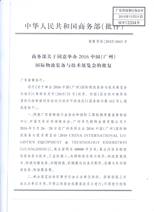 重磅喜讯!将于2016年5月26-28日在广州•中国进出口商品交易会馆B区隆重举办的“中国(广州)国际物流装备与技术展览会(以下简称:广州物流装备展)”已获得中国商务部批准,批文号:商服贸批[2015]1043字号、粤商务贸函[2016]10字号。这也是目前由中国企业自主创办的物流展会中唯一获得商务部批文的新一里程碑。