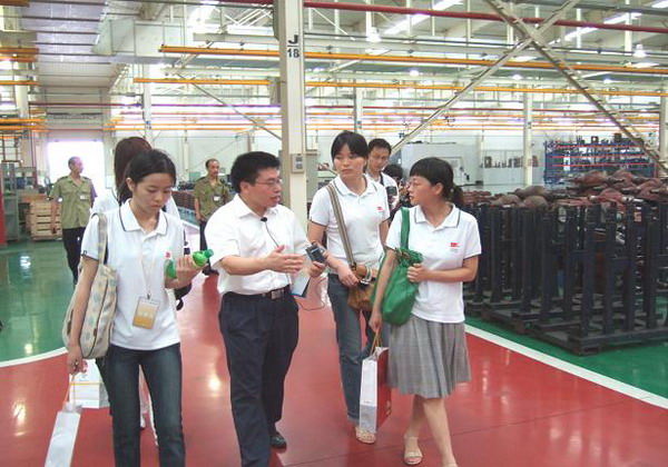 下午四点半,车队成员前往考察采访的第二站——安徽叉车集团公司。公司领导在合力工业园桥箱事业部门前迎接车队的到来,并在桥箱事业部的中门广场进行了产品展示,展出了含电动叉车、内燃叉车等多个系列产品,工作人员就各个产品的主要性能、自主创新的技术核心和拥有的专利向车队人员做了简要介绍。随后,通过播放《合力与您同行》的宣传片和举办媒体座谈会,合力公司向考察团展示了“求实、创新、团结、高效”的企业精神和着力打造自主品牌的决心。