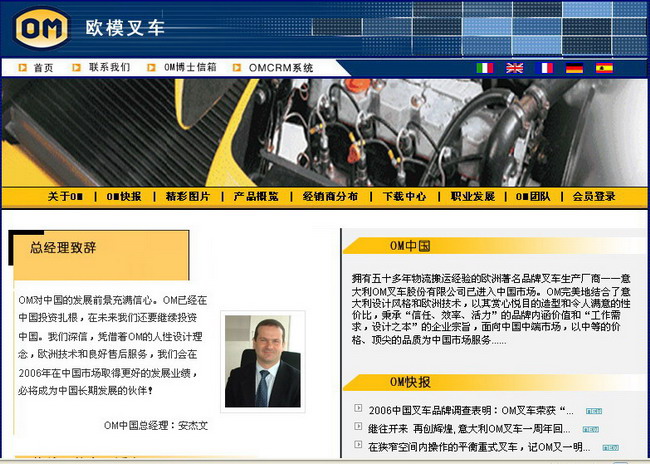 该新版面的网站依然以OM叉车特有的深蓝和桔黄色为基础颜色,主页突出OM在中国市场所推出的XD系列平衡重柴油叉车及OM中国情况。