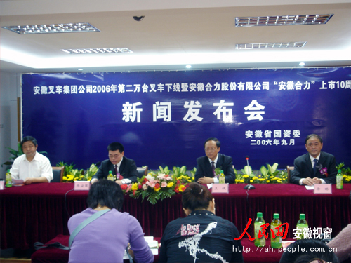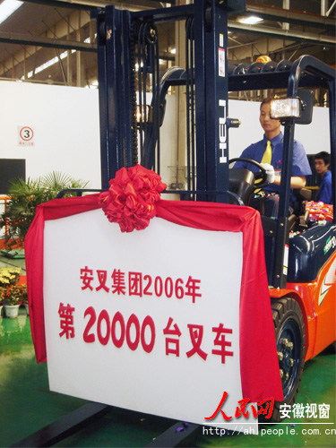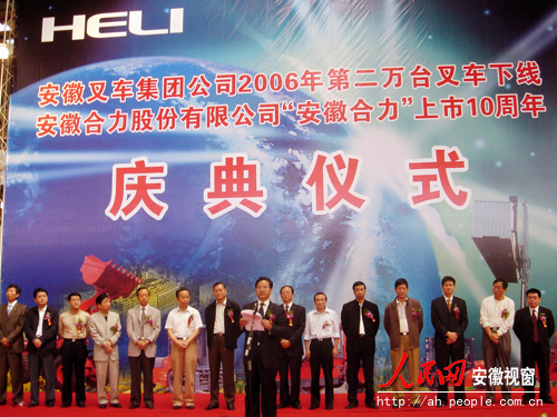 在安徽叉车集团公司2006年第20000台叉车下线暨安徽合力股份有限公司上市10周年庆典仪式上,安徽省副省长黄海嵩出席并高度赞扬了叉车集团辉煌业绩;安徽合力股份有限公司总经理杨安国介绍了公司发展历程、最新产品、技术创新以及公司取得的成就等;为加强与合作伙伴的紧密合作,共同打造"中国叉车第一品牌",集团公司党委书记、总经理王健亲手把第20000台叉车赠送给公司的合作伙伴。(丁志强 文/摄)