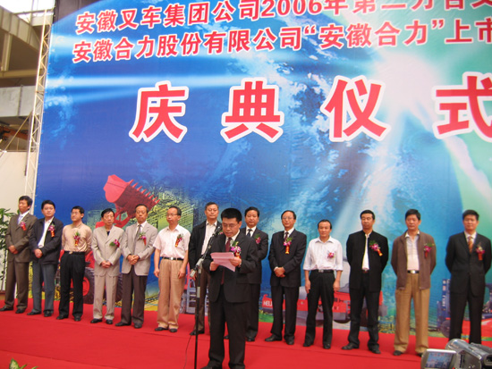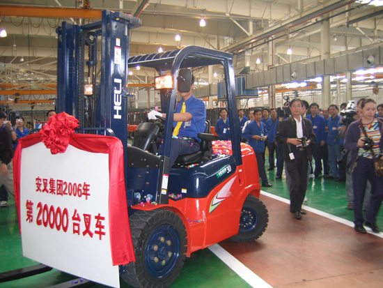 2006年9月16日上午,安徽叉车集团与合力股份公司在新落成的合力工业园迎来了2006年第二万台叉车下线庆典及“安徽合力”上市十周年庆典这个双喜临门的日子。