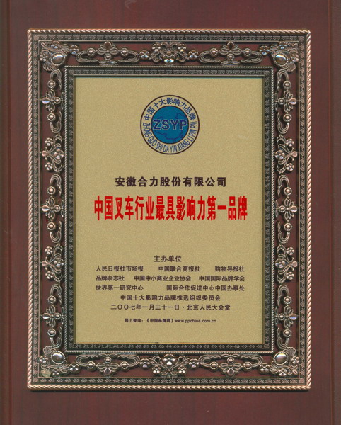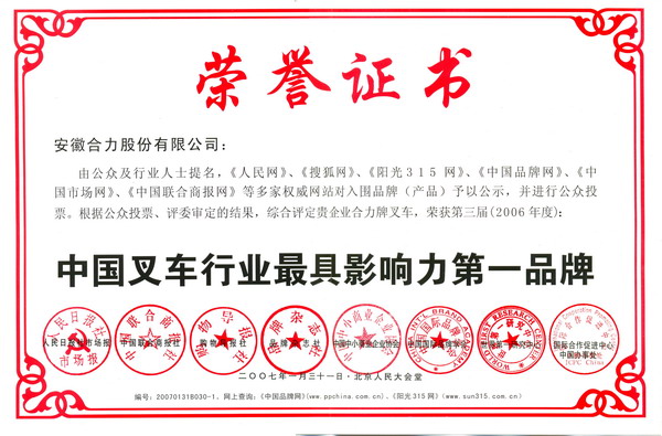 2007年1月31日,“2006中国十大影响力品牌”新闻发布会暨“第三届中国品牌影响力高峰论坛年会”在人民大会堂圆满落幕,合力载誉而归。由主办单位宣布:根据公众投票、评委审定安徽合力股份有限公司合力牌叉车,荣获第三届(2006年度)“中国叉车行业最具影响力第一品牌” ,公司张德进董事长荣获第三届(2006年度)“中国品牌建设十大优秀企业家”,公司杨安国总经理荣获第三届(2006年度)“中国品牌建设突出创新贡献奖”。本次评审活动由人民日报社市场报、中国联合商报社、品牌杂志社、中国国际品牌学会、人民网、搜狐网、阳光315网、中国品牌网等众多媒体参与,对入围品牌(产品)予以公示,并进行公众投票所取得。