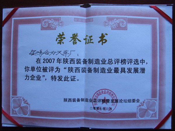 2007年3月21日下午,在古城西安隆重举行的中国西部装备制造业发展论坛暨陕西装备制造业总评榜颁奖盛典上,宝鸡合力叉车厂荣获“陕西装备制造业最具发展潜力企业”称号。
