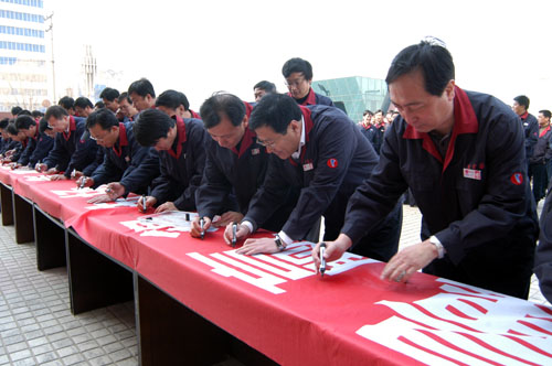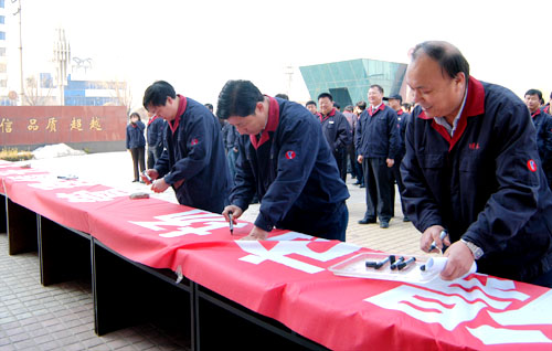 誓师大会后,与会人员在写有"质量赢得市场,管理提升效益"的红色绸布上进行了现场签名。