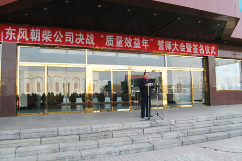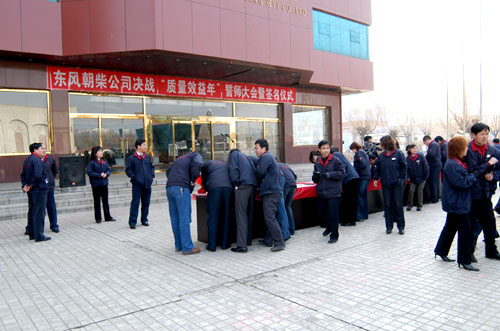 3月20日上午10点,东风朝柴公司决战"质量效益年"誓师大会暨签名仪式在21层办公大楼前举行。公司领导赵庄、李凤海、冯彦春、全体中干、劳动模范、模范共产党员及员工代表计200余人参加了誓师大会暨签名仪式。