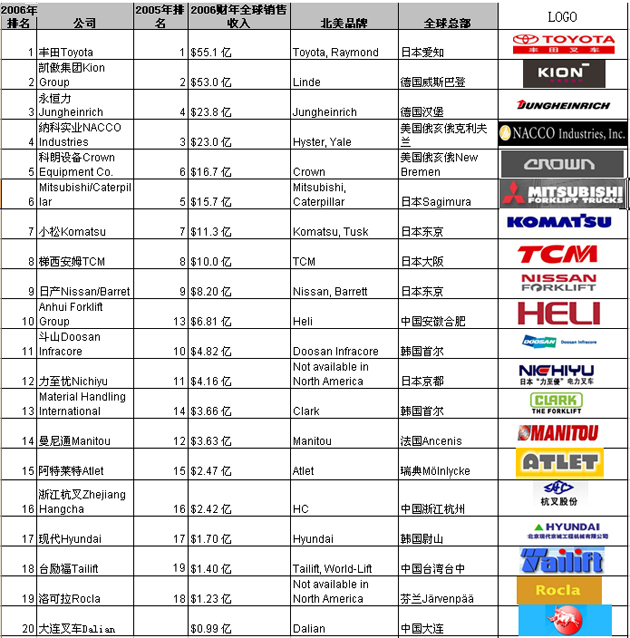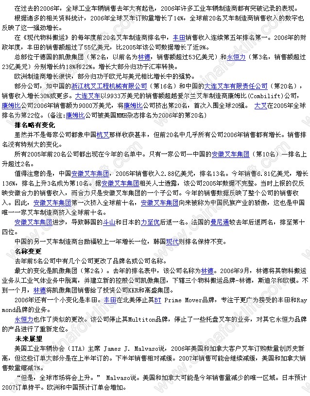 (中国叉车网(www.chinaforklift.com)根据美国现代物料搬运杂志编译,如需要转载请注明出处)相关连接:2005全球叉车制造商前20...