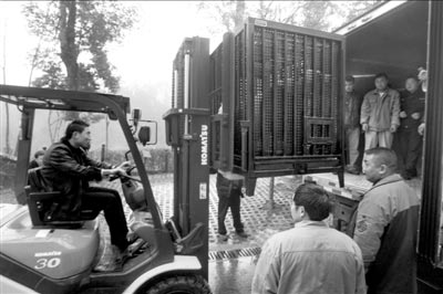 工作人员只好用叉车对“圆圆”做了装笼演练。黄治表示,装笼演练非常顺利。23日基本上就按这个流程走。”