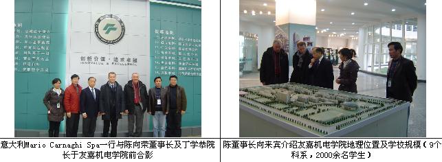 意大利Mario Carnaghi Spa公司始建于1929年,现由Mario Carnaghi总裁和公司首席执行官共同运营管理。公司位于米兰马尔本萨机场和米兰市之间。自公司成立以来,共生产3000台铣床,立式旋床,刨床。Mario Carnaghi Company始终由同一家族经营,拥有80年发展历史, 主要制造传统机床及数控机床。该公司主要经营层Mr. Riccardo Fiorani、Mr. Franco Piantoni于2009/12/14参访友嘉实业集团下沙厂群(友嘉机电学院、丽伟、友华、友高)及萧山总部友佳精密机械有限公司,并在12/15于友嘉实业集团大陆营运总部国际会议厅签订合作协议,同时为我司业务人员和技术人员进行为期一天的培训。