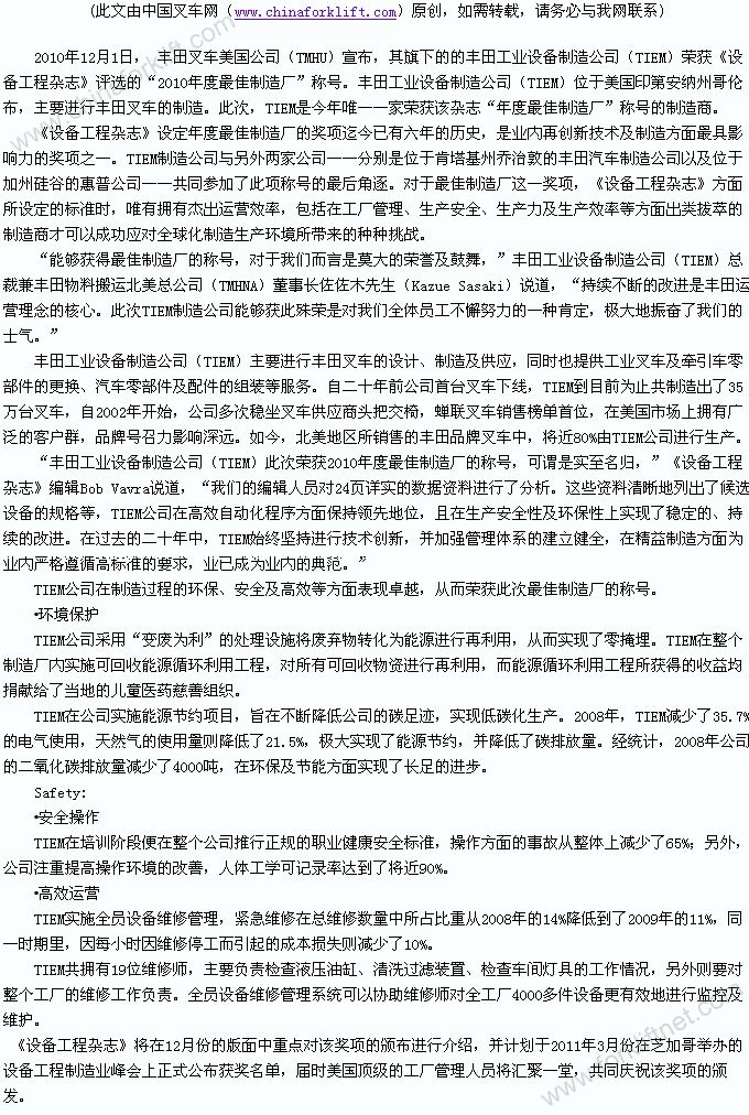丰田工业设备制造公司及美国、加拿大的所有丰田制造厂均符合ISO14001标准,且因其环境管理体系及其不断努力改进而备受赞誉。丰田是全球首家亦是唯一一家在工厂中配备UL、EPA及CARB认证压缩天然气(CNG)燃料系统的制造商。丰田8系列液化石油气、汽油及压缩天然气叉车排出的烟雾比当前美国联邦标准减少70%,达到了更为严格的加州2010排放标准。丰田优质的客户服务已延伸到全国。经授权的68家丰田工业设备代理商在美国有188家代理机构,提供集整车、二手叉车、叉车配件、服务、融资于一体的一站式、全方位客服支持。