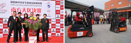 2010年12月18日,深圳,金风送爽,由林德(中国)叉车有限公司、中华全国工商业联合会、中国物流与采购联合会、中国工程机械工业协会工业车辆分会以及招商局物流集团联合举办的“林德杯”中国叉车职业技能巡回赛南方大区决赛在招商局物流集团鸣锣开赛。深圳市国际配送协会秘书长徐先生,广东省物流行业协会副秘书长魏女士、招商局物流集团运营中心副总虞先生,质量管理与客户服务部总经理关女士、林德(中国)叉车有限公司市场策略部总监郑盛泉先生以及广东省近15家媒体参加了本次活动。