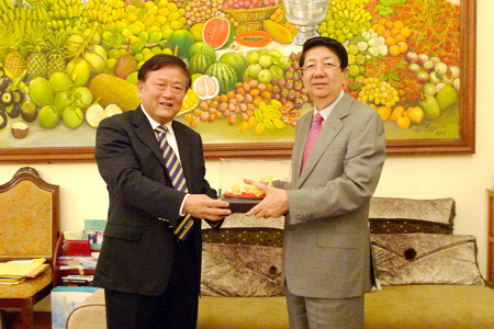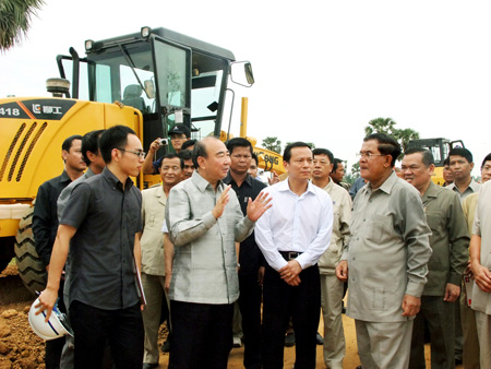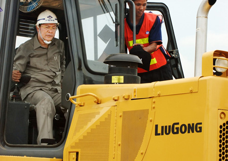 王晓华赠送礼物给宋安副首相柬首相洪森操作柳工推土机中国驻柬大使潘广学向洪森介绍中国工程机械的发展