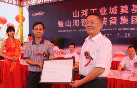 湖南省工商行政管理局注册分局朱贤国局长颁发山河智能装备集团登记证书