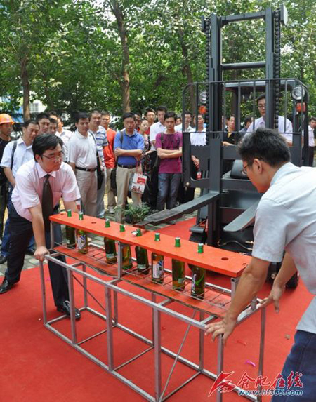 林德(中国)叉车有限公司合肥销售服务中心成立仪式上的叉车开啤酒瓶盖表演