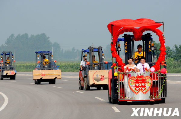 据悉,新郎孔清洋曾是一名叉车司机,新娘申立坤是叉车销售人员。新郎在购买叉车时与新娘相识。随后,两人开始恋爱,并最终决定相守终身。谈婚论嫁时,他们突发奇想——用8辆叉车组成一支婚车队,既个性又省钱,并且以这种特殊的形式迎接“中国情人节”——“七夕节”到来。