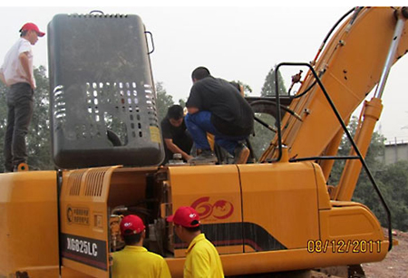 说话间,不知不觉,我们就开到了灰尘弥漫的小鸦公路上,果不其然,两边都是挖掘机在阵阵巨大的轰鸣声中在忙着挖土、平地。远远望去,尽管视线不太好,但仍可见到好几台厦工挖掘机在不远处不停地干活。当地的服务主管带路,车子碾着刚刚被大雨泡过的泥泞土路,一路前行,从最远处的挖掘机开始走访。看见排成一队的贴着厦工六十周年同心圆标志的服务车开过,沿途的挖掘机纷纷鸣笛向我们致意。来到了最远处的一台XG822LC挖掘机,只见挖掘机正在忙碌着挖沟、做平整作业,根本都没有时间停下来。挖掘机司机小张师傅打开窗户,向我们大声喊:“挖机很好!不用检查了!我们很忙!没空停下来!”我们笑了笑,挥挥手让他继续干活,停在一边耐心地等候着。约过了十来分钟,机器总算停了下来。小张师傅从挖机上跳下来,指着湖北润达的两位维修师傅,笑着跟我们说:“他们俩没事就来我们工地上转,主动看有没有问题,所以我们机子都保养得比较好,没什么事。”尽管如此,服务主管赵鹏魁还是带着工具上了挖掘机,进行了仔细检查,并向小张师傅讲解了日常保养注意事项。这时候,正在附近的另外一台XG825LC挖掘机的何老板赶了过来,说:“帮我把我们那一台机子也检查一下吧!”湖北润达服务部郁部长笑眯眯地拍拍何老板的肩膀,说:“您别急,一台一台来,我们一台都不会落下的!”