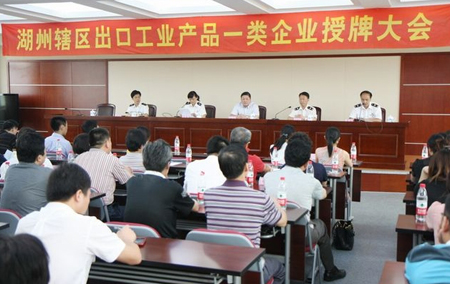 8月3日下午,浙江省出入境检验检疫局湖州辖区“出口工业产品一类企业”授牌大会在湖州检验检疫局隆重举行。浙江检验检疫局党组成员、副局长徐日新出席会议,并与湖州局在家党组成员一起为一类企业授牌,湖州市出入境检验检疫局党组书记、局长宋海龙发表了重要讲话,罗勤副局长主持大会。湖州辖区33家一类企业的代表与10家二类企业的代表一起共同见证了这一庄严时刻。