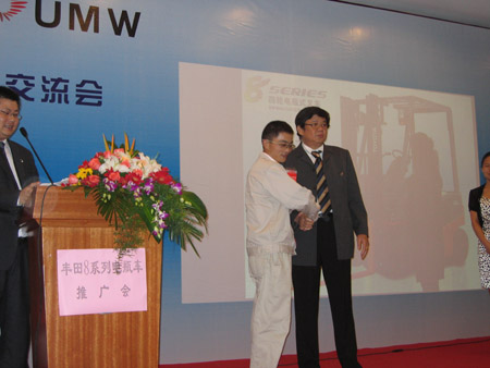 下午4点在杭州文汇大酒店,交流会正式开始。来自丰田产业车辆的植田总经理和优迈达陈来麟总经理先后致辞,谈到了优迈达和丰田之间悠久的合作历史与关系,丰田为中国市场投入大量技术支持从而先后开发了Z系列内燃叉车与8系列电瓶叉车。随后优迈达市场部倪经理向来宾,详细阐述了8系列电瓶叉车作为丰田未来的全球电瓶车标准车型所具备的环保高效、安全可靠、便捷舒适和配置丰富等特点。来宾都迫不及待的参与到之后的试驾活动中。此次交流会对于丰田8系列电瓶车在沪杭地区的发售起到了有效的推广作用。
