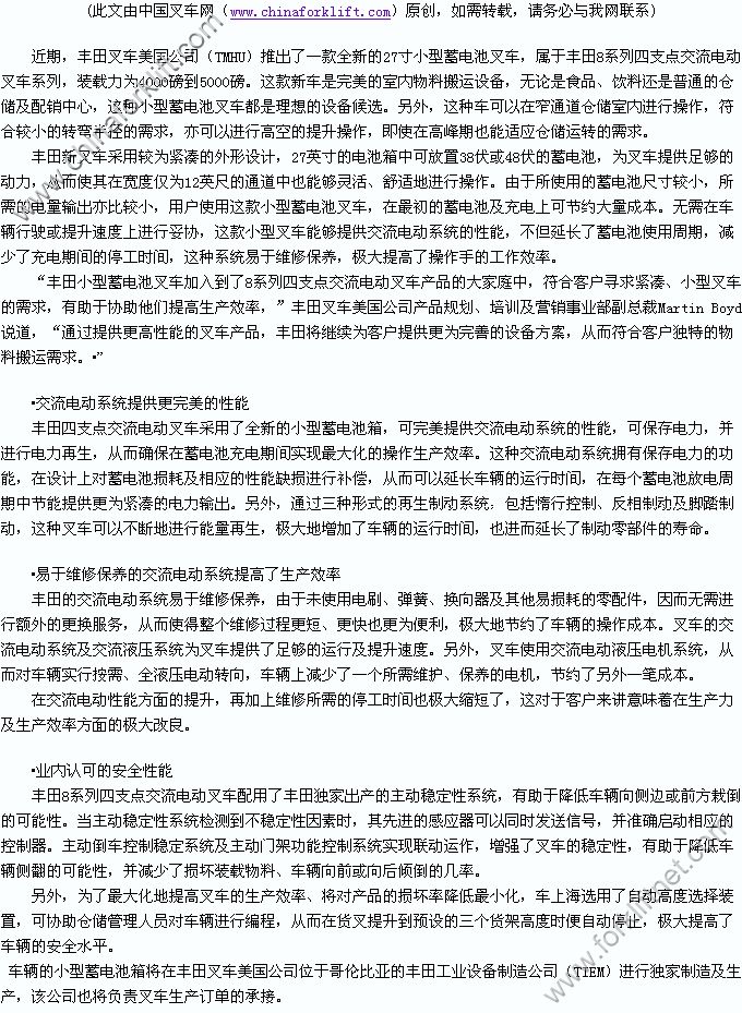 丰田叉车美国公司在美国加州欧文创建至今已有40多年。自2002年起,丰田已是美国首屈一指的叉车供应商,生产丰田品牌的高质量叉车。在性能卓越的基础上,丰田以优质、可靠、持久而闻名。质量是丰田所有制造公司(包括位于印第安纳州哥伦布的丰田工业设备制造公司(TIEM))所采用的丰田生产体系的标志,该体系全球闻名。大部分在美销售的叉车——包括8系列都是丰田工业设备制造公司制造的。