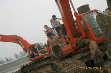 第二天清早我们的维修人员就到达现场,与客户讨论抢救办法,10点左右水位逐渐下降,维修人员开始投入营救,我们的服务班长张金安也加入了营救队伍中。由于到处都是水与污泥,维修人员脱掉外衣,潜入水中,赤身在泥土中工作,在岸边的所有人看到我们维修人员不怕脏不怕累都夸赞我们斗山维修人员个个都是好样的!!