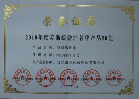 近日,由国家质检总局、教育部、工业和信息化部、住房和城乡建设部、国务院国有资产监督管理委员会、国家广播电影电视总局、国家旅游局、全国工商联、全国总工会、共青团中央、上海市人民政府共同主办的全国“质量月”活动启动仪式暨苏浙皖赣沪质量表彰大会在上海举行。“苏浙皖赣沪”四省一市培育了一批互认名牌产品,在表彰会上,浙江诺力机械股份有限公司“NOBLIFT诺力”液压搬运车被授予“2010年度苏浙皖赣沪名牌产品50佳”荣誉称号,这也是湖州市唯一被授予荣誉称号的企业,在国内市场,特别是华东市场有着广泛的影响力。