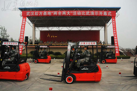 9月27日上午,总后武汉后方基地“全员额全建制,大练兵大比武”叉车花样驾驶现场,10名大学生女兵驾驶叉车时而齐头并进,时而逶迤前行,仿佛为叉车注入了生命和灵性,精彩表现赢来现场上千官兵阵阵掌声。