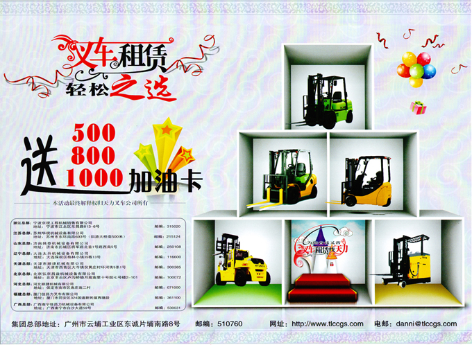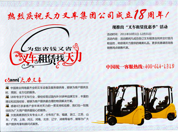 为庆祝天力叉车集团公司成立18周年,回馈4万多家客户多年来对天力叉车的一贯支持和信赖,公司现推出“叉车租赁优惠季”大型促销活动,活动时间为2011年10月1日--- 12月31日。叉车租赁,轻松之选,凡在活动期间成功签订叉车租赁合同并交付首月租金的客户,我们将为您送上精美礼品一份,更多优惠请咨询公司各区域销售代表或拨打全国统一客服热线:400-614-1319,欢迎您的垂询!