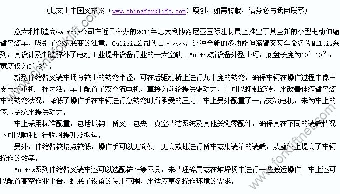 意大利Galizia公司推出全新电动伸缩臂叉装车