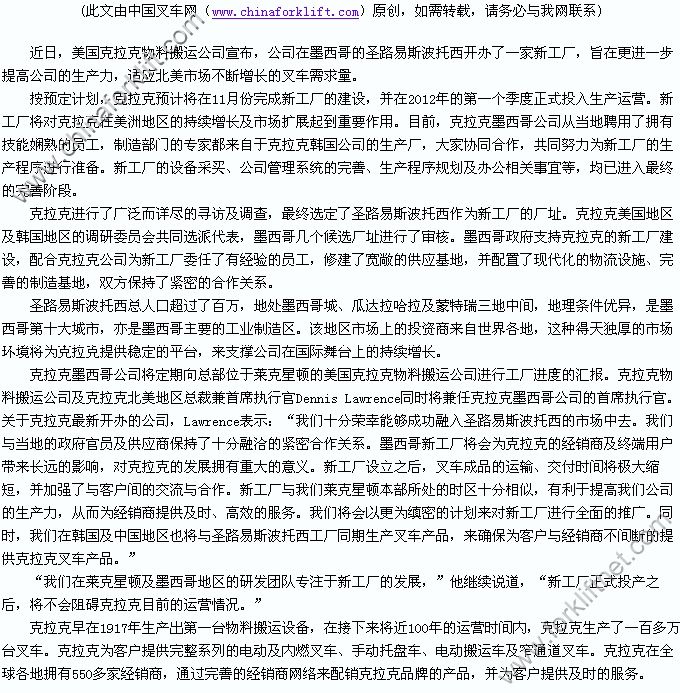 关于克拉克 自1917年生产出第一台物流叉车以来,克拉克在其85年的历史中生产了100多万台叉车,成为此行业的领头人。克拉克生产全系列电动和内燃叉车、窄通道叉车、电动托盘叉车、堆垛机和电动拖头。另外,克拉克还提供拣选车和托盘叉车。其产品通过全球550多个代理商网络分销。 美国克拉克叉车兼并韩国三星叉车公司。2003年克拉克公司被韩国永安集团兼并。2004年,克拉克叉车在中国山东将投资建立其全球制造工厂。克拉克叉车在中国有代理商销售。