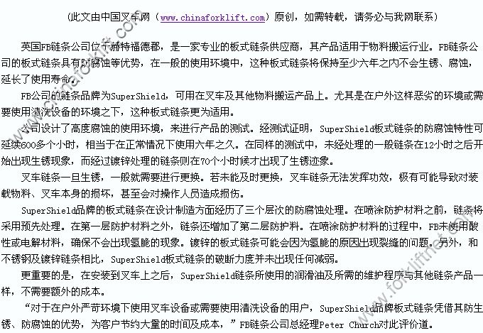 FB链条公司是Addtech公司在英国地区开设的子公司。Addtech公司是一家瑞典公司,股份在斯德哥尔摩证券交易所上市。FB链条公司在英国开设工厂,专业制造板式链条及相关产品,适用于物料搬运行业。FB如今已成为英国及爱尔兰地区最为知名的链条产品供应商。除了板式链条作为主打产品之外,FB链条公司还推出了传动链条、输送链条、尖齿链、地脚螺栓、锚定螺杆、滑轮及其他一些专用配件。