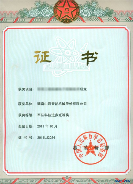 由山河智能装备股份有限公司参与承担的总装备部预研项目成果喜获2011年度军队科技进步二等奖。该项目是由总装某研究所与山河智能共同合作承担并完成。研制过程中创新性的采用功能模块分布式设计理念和可靠的隔离技术,有力地提升了军用工程机械电控系统的通用化、模块化和柔性化设计水平,增强了系统可靠性指标,提高军用工程机械的总体效能,为军用工程机械信息化、智能化的实现及其长远发展奠定必要的技术基础。