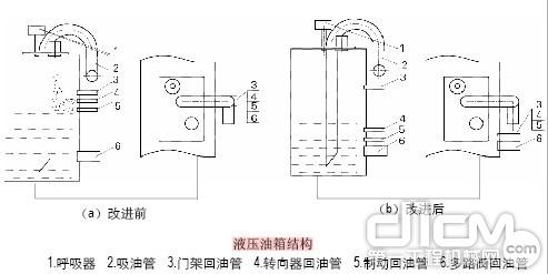 由于液压油箱存在以上问题,经研究,我们决定对液压油箱上回油管的位置重新进行排布。改进后的液压油箱结构如附图(b)所示,具体方法如下:将回油频繁的制动泵回油管、转向器回油管和多路阀回油管全部布置在液压油液面以下,其回油口与吸油管的位置互相错开,并尽可能拉大这些回油口与呼吸器的距离。