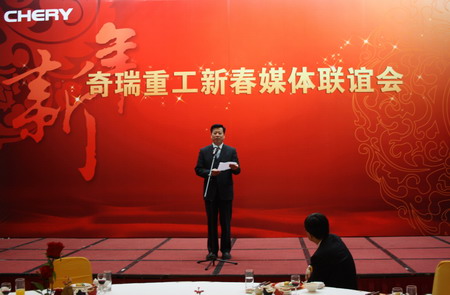 奇瑞重工总经理王金富在招待晚宴上表示:“热烈欢迎大家在百忙之中参加奇瑞重工新年媒体联谊会,在这里我代表奇瑞重工全体员工,对大家的到来表示热烈的欢迎!大家知道,奇瑞重工公司是一个新生企业,她的产生是奇瑞集团全体领导干部和员工对中国机械装备制造的执着努力与追求,她的主张是中国机械装备制造业发展的必然要求,她的进步是与我们所有与会的朋友热情关心和支持分不开!我们有理由相信,在中国经济和发展现代制造业以及振兴民族工业的大前提背景下,奇瑞重工必将伴随中国机械装备制造业的发展而取得更大的发展。”