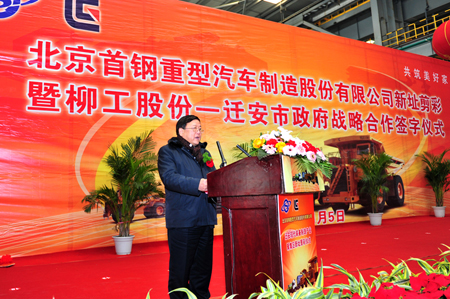 1月5日上午,“北京首钢重汽新址剪彩暨柳工与迁安市政府战略合作签字仪式”在河北省迁安市隆重举行。柳工集团董事长王晓华、股份公司副总裁黄建兵以及迁安市市长李忠,中国工程机械协会副秘书长王金星,首钢总公司总经理助理、首钢矿业总经理郝树华等,与柳工经销商代表、首钢重汽供应商代表、首钢重汽全体员工共同参加迁址剪彩,并见证柳工与迁安市政府签署战略合作协议。