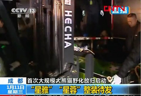 安徽合叉叉有限公司自主生产的蓄电池平衡重式叉车拖着近2米长的铁笼子,载着憨态可掬的6只大熊猫轻松平稳地驶向大卡车。