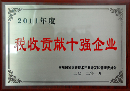 (江苏)在2010年度工业税收上缴企业中名列第一,被常州国家高新技术产业开发区管理委员会授予“2010年度税收贡献十强企业”称号。