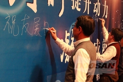 2011年1月,斗山自制驱动桥下线,这是DISD首次完成对装载机关键性能部品的自主生产;2011年8月,开始对工厂进行大规模扩建,为实现18,000台的产能做好充足准备,这是工厂竣工后第三年实施的重大扩建工程,预示着DISD的成长速度;为了提高研发力量,实现斗山装载机和部品品质的完全差别化,2011年11月,研发中心、可靠性评价中心和研发试制实验室开始基础工程建设;2011年12月,斗山自制变速箱试制成功;同时在改善方面,全年共提交805个改善提案,改善率100%;为建造绿色工厂,使EHS意识深入人心,举办了漫画展、消防趣味运动会等活动;在企业文化建设的道路中,一直为创建学习生组织,自豪、信赖、快乐的职场而不断努力……一点一滴的进步铸就了今天的辉煌,让现场所有人心潮澎湃。