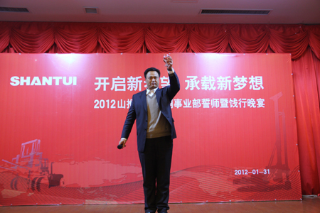 1月31日,2012年山推机械营销事业部誓师暨饯行晚宴在济宁玉满城喜宴堂隆重举行。山推机械党委书记、总经理高腊生,党委副书记、工会主席王林泽,副总经理万国全、孙建设、蔄喜良、倪令华、孙静,研究院院长伊长春出席晚宴,营销事业部各部门负责人以及全体营销业务人员参加了本次活动。