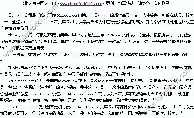 日产叉车公司是日产汽车集团之子公司,是世界上最大的叉车生产厂家之一。日产叉车公司拥有资本4500万日元(约合38万美元),目前统管7家 合作销售公司。在本年度内,日产计划将销售公司扩大到10家。此外还将加强公司在中国市场的售后服务和维修体制。 去年,日产公司的叉车等运输机械在全球的销售额达到700亿日元(约合5.9亿美元),但是在中国市场所占的比率却是微乎其微。鉴于中国市场的急剧扩大,该公司准备加强在中国的销售,力争在一两年内使叉车销量从目前的150台扩大到300台。