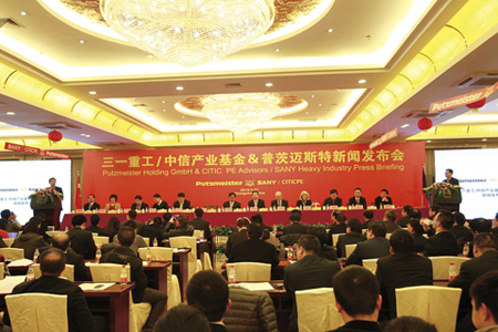 下午两点,三一工业城的宴会厅里,嘉宾云集,高朋满座。“龙象共舞 三一重工收购德国普茨迈斯特”新闻发布会正在这里举行。这是三一近两年来规格最高的一次新闻发布会,湖南省委常委、副省长陈肇雄、省人大常委会副主任蒋作斌,普茨迈斯特创始人施莱西特、三一重工董事长梁稳根、三一集团总裁唐修国、三一重工总裁向文波、中信投资基金董事长刘乐飞等出席会议。来自国内外60多家主流媒体齐聚一堂,聚焦这一改变世界混凝土机械行业竞争格局的重大新闻事件。