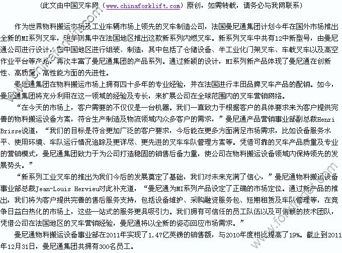 越野叉车领域一直处于世界领先地位。是法国巴黎的上市公司,主要致力于工业叉车领域、建筑领域、农业领域三大领域的发展。曼尼通集团倡导全球化的营销理念,并一贯秉承:“让我们的客户、生产和合作者满意”的宗旨,曼尼通集团现已在全球有23个附属公司,其中17个是销售公司,5个工业性子公司,9个生产配套件基地,600个分销商,足迹遍布120个国家。曼尼通(杭州)叉车有限公司于2003年6月9日在浙江省杭州市余杭区余杭经济开发区北沙西路20号注册成立 ,是曼尼通集团在中国大陆投资的第一家独资子公司,公司注册资本540万美元,投资总额900万美元。主要生产经营1.5-3.5T内燃平衡叉车,产品销往