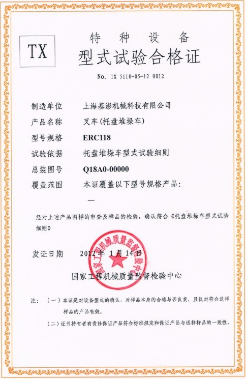 上海基澎机械科技有限公司的ERC118 型式试验合格证