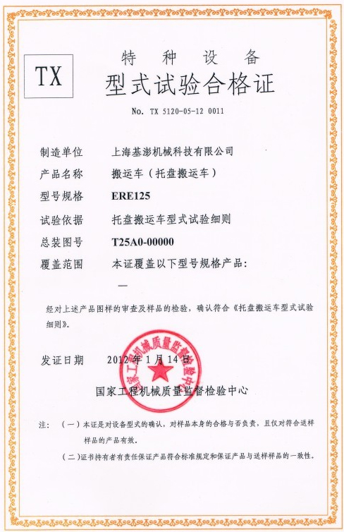 2012年1月14日,型号ERE125通过国家工程机械质量监督检验中心认证成功,并颁发合格证。