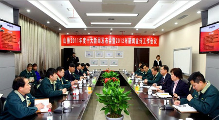 2月20日下午,“山推2011年度十大新闻发布会”暨2012年度新闻宣传工作会议在总部大楼203会议室召开,会上隆重发布了“山推2011年度十大新闻”事件,表彰了十大新闻所在单位、优秀新闻组织单位及十佳通讯报道员。公司党委副书记孙学科出席,公司企业文化部、各职能部室、事业部、子公司相关人员以及十佳新闻通讯员代表40余人参加了会议。
